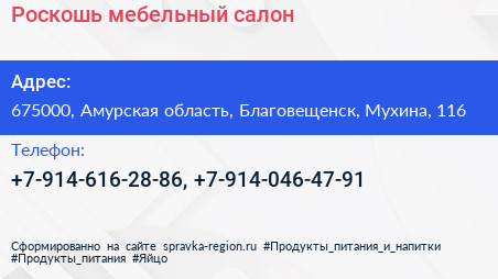 Роскошь, мебельный салон по адресу 675000, Амурская область, Благовещенск, Мухина, 116 в дальнейшем Организация, размещена в следующих категориях: