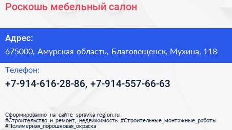 Роскошь, мебельный салон по адресу 675000, Амурская область, Благовещенск, Мухина, 118 в дальнейшем Организация, размещена в следующих категориях: