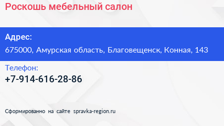 Роскошь, мебельный салон по адресу 675000, Амурская область, Благовещенск, Конная, 143 в дальнейшем Организация, размещена в следующих категориях: