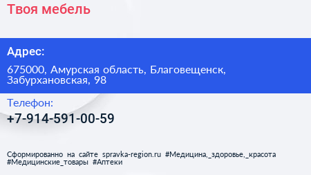Твоя мебель по адресу 675000, Амурская область, Благовещенск, Забурхановская, 98 в дальнейшем Организация, размещена в следующих категориях: