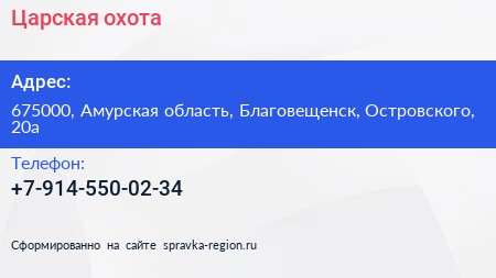 Царская охота по адресу 675000, Амурская область, Благовещенск, Островского, 20а в дальнейшем Организация, размещена в следующих категориях: