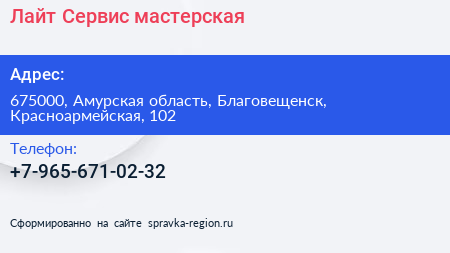Лайт-Сервис, мастерская по адресу 675000, Амурская область, Благовещенск, Красноармейская, 102 в дальнейшем Организация, размещена в следующих категориях: