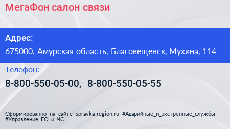 МегаФон, салон связи по адресу 675000, Амурская область, Благовещенск, Мухина, 114 в дальнейшем Организация, размещена в следующих категориях: