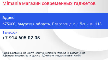 Mimania, магазин современных гаджетов по адресу 675000, Амурская область, Благовещенск, Ленина, 113 в дальнейшем Организация, размещена в следующих категориях: