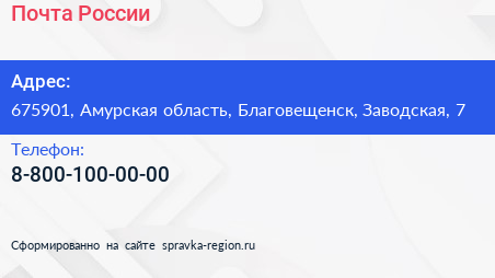 Почта России по адресу 675901, Амурская область, Благовещенск, Заводская, 7 в дальнейшем Организация, размещена в следующих категориях: