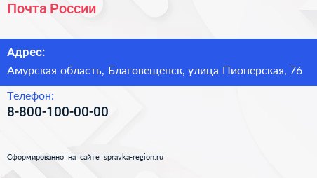 Почта России по адресу Амурская область, Благовещенск, улица Пионерская, 76 в дальнейшем Организация, размещена в следующих категориях: