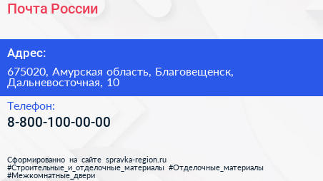 Почта России по адресу 675020, Амурская область, Благовещенск, Дальневосточная, 10 в дальнейшем Организация, размещена в следующих категориях:
