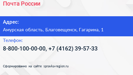 Почта России по адресу Амурская область, Благовещенск, Гагарина, 1 в дальнейшем Организация, размещена в следующих категориях: