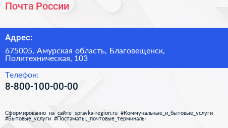 Почта России по адресу 675005, Амурская область, Благовещенск, Политехническая, 103 в дальнейшем Организация, размещена в следующих категориях: