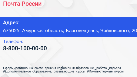 Почта России по адресу 675025, Амурская область, Благовещенск, Чайковского, 20 в дальнейшем Организация, размещена в следующих категориях: