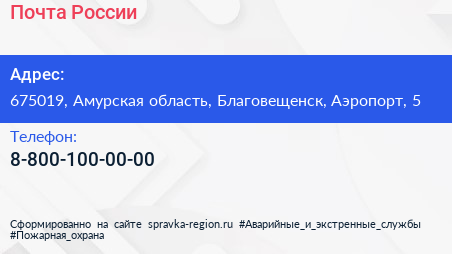 Почта России по адресу 675019, Амурская область, Благовещенск, Аэропорт, 5 в дальнейшем Организация, размещена в следующих категориях: