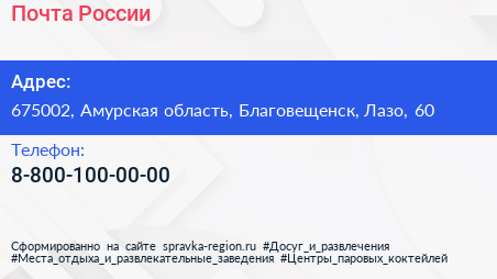 Почта России по адресу 675002, Амурская область, Благовещенск, Лазо, 60 в дальнейшем Организация, размещена в следующих категориях: