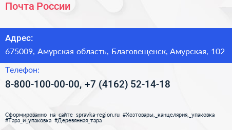 Почта России по адресу 675009, Амурская область, Благовещенск, Амурская, 102 в дальнейшем Организация, размещена в следующих категориях: