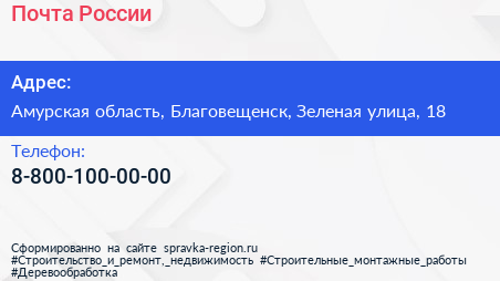 Почта России по адресу Амурская область, Благовещенск, Зеленая улица, 18 в дальнейшем Организация, размещена в следующих категориях: