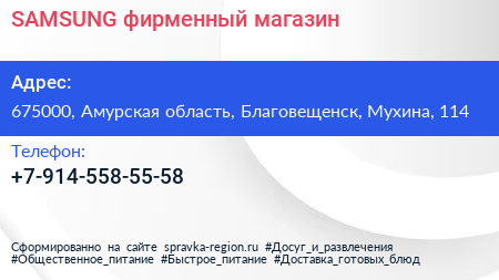 SAMSUNG, фирменный магазин по адресу 675000, Амурская область, Благовещенск, Мухина, 114 в дальнейшем Организация, размещена в следующих категориях: