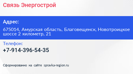 Связь Энергострой по адресу 675014, Амурская область, Благовещенск, Новотроицкое шоссе 2 километр, 21 в дальнейшем Организация, размещена в следующих категориях: