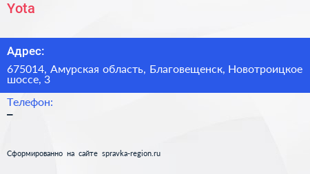 Yota по адресу 675014, Амурская область, Благовещенск, Новотроицкое шоссе, 3 в дальнейшем Организация, размещена в следующих категориях: