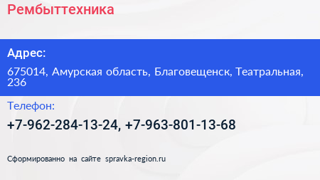 Рембыттехника по адресу 675014, Амурская область, Благовещенск, Театральная, 236 в дальнейшем Организация, размещена в следующих категориях: