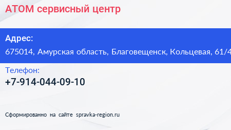 АТОМ, сервисный центр по адресу 675014, Амурская область, Благовещенск, Кольцевая, 61/4 в дальнейшем Организация, размещена в следующих категориях: