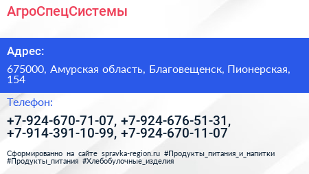 АгроСпецСистемы по адресу 675000, Амурская область, Благовещенск, Пионерская, 154 в дальнейшем Организация, размещена в следующих категориях: