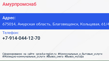Амурпромснаб по адресу 675014, Амурская область, Благовещенск, Кольцевая, 61/4 в дальнейшем Организация, размещена в следующих категориях: