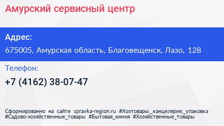 Амурский сервисный центр по адресу 675005, Амурская область, Благовещенск, Лазо, 128 в дальнейшем Организация, размещена в следующих категориях: