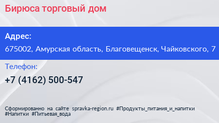 Бирюса, торговый дом по адресу 675002, Амурская область, Благовещенск, Чайковского, 7 в дальнейшем Организация, размещена в следующих категориях: