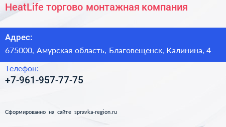 HeatLife, торгово-монтажная компания по адресу 675000, Амурская область, Благовещенск, Калинина, 4 в дальнейшем Организация, размещена в следующих категориях: