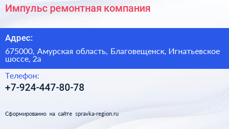 Импульс, ремонтная компания по адресу 675000, Амурская область, Благовещенск, Игнатьевское шоссе, 2а в дальнейшем Организация, размещена в следующих категориях: