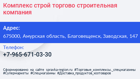 Комплекс строй, торгово-строительная компания по адресу 675000, Амурская область, Благовещенск, Заводская, 147 в дальнейшем Организация, размещена в следующих категориях: