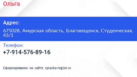 Ольга по адресу 675028, Амурская область, Благовещенск, Студенческая, 43/1 в дальнейшем Организация, размещена в следующих категориях:
