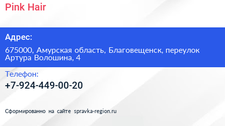Pink Hair по адресу 675000, Амурская область, Благовещенск, переулок Артура Волошина, 4 в дальнейшем Организация, размещена в следующих категориях: