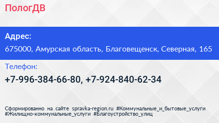 ПологДВ по адресу 675000, Амурская область, Благовещенск, Северная, 165 в дальнейшем Организация, размещена в следующих категориях: