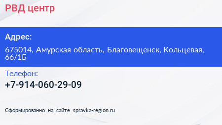 РВД центр по адресу 675014, Амурская область, Благовещенск, Кольцевая, 66/1Б в дальнейшем Организация, размещена в следующих категориях: