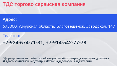 ТДС, торгово-сервисная компания по адресу 675000, Амурская область, Благовещенск, Заводская, 147 в дальнейшем Организация, размещена в следующих категориях:
