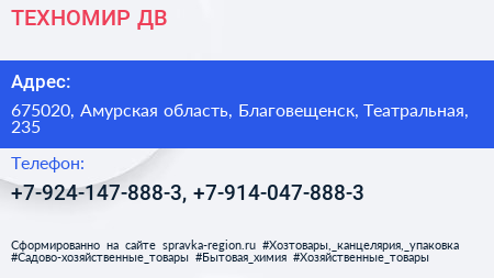 ТЕХНОМИР-ДВ по адресу 675020, Амурская область, Благовещенск, Театральная, 235 в дальнейшем Организация, размещена в следующих категориях: