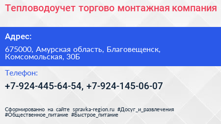 Тепловодоучет, торгово-монтажная компания по адресу 675000, Амурская область, Благовещенск, Комсомольская, 30Б в дальнейшем Организация, размещена в следующих категориях: