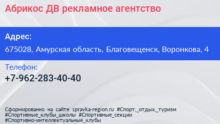 Абрикос ДВ, рекламное агентство по адресу 675028, Амурская область, Благовещенск, Воронкова, 4 в дальнейшем Организация, размещена в следующих категориях: