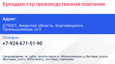 Брендмастер, производственная компания по адресу 675027, Амурская область, Благовещенск, Промышленная, 6/3 в дальнейшем Организация, размещена в следующих категориях: