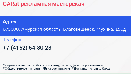 CARat, рекламная мастерская по адресу 675000, Амурская область, Благовещенск, Мухина, 150д в дальнейшем Организация, размещена в следующих категориях: