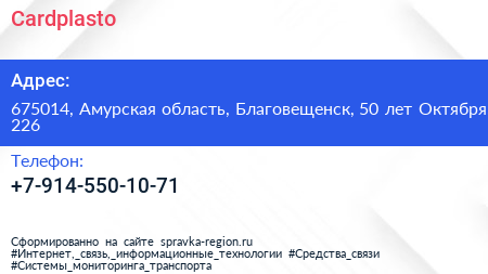 Cardplasto по адресу 675014, Амурская область, Благовещенск, 50 лет Октября, 226 в дальнейшем Организация, размещена в следующих категориях: