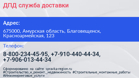 ДПД, служба доставки по адресу 675000, Амурская область, Благовещенск, Красноармейская, 123 в дальнейшем Организация, размещена в следующих категориях: