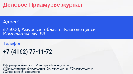 Деловое Приамурье, журнал по адресу 675000, Амурская область, Благовещенск, Комсомольская, 89 в дальнейшем Организация, размещена в следующих категориях: