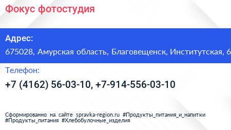 Фокус, фотостудия по адресу 675028, Амурская область, Благовещенск, Институтская, 6 в дальнейшем Организация, размещена в следующих категориях: