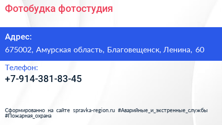 Фотобудка, фотостудия по адресу 675002, Амурская область, Благовещенск, Ленина, 60 в дальнейшем Организация, размещена в следующих категориях: