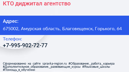 КТО, диджитал-агентство по адресу 675002, Амурская область, Благовещенск, Горького, 64 в дальнейшем Организация, размещена в следующих категориях: