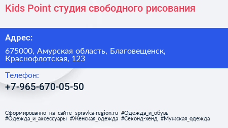 Kids Point, студия свободного рисования по адресу 675000, Амурская область, Благовещенск, Краснофлотская, 123 в дальнейшем Организация, размещена в следующих категориях: