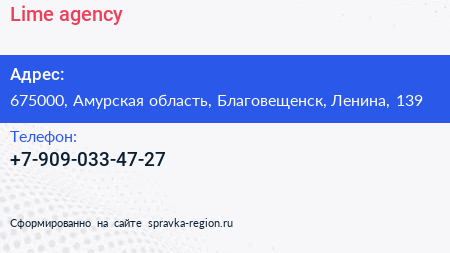 Lime agency по адресу 675000, Амурская область, Благовещенск, Ленина, 139 в дальнейшем Организация, размещена в следующих категориях: