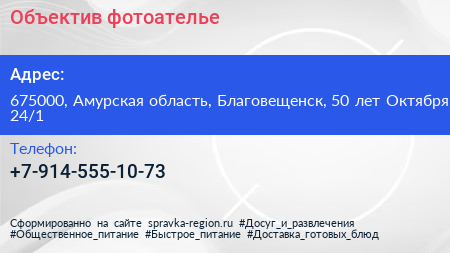 Объектив, фотоателье по адресу 675000, Амурская область, Благовещенск, 50 лет Октября, 24/1 в дальнейшем Организация, размещена в следующих категориях: