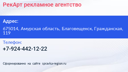РекАрт, рекламное агентство по адресу 675014, Амурская область, Благовещенск, Гражданская, 119 в дальнейшем Организация, размещена в следующих категориях: